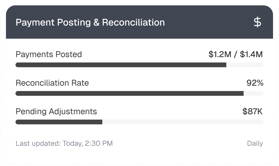 Our team processes Electronic Remittance Advice (ERA 835) and manual payment postings with auto-reconciliation to General Ledger (GL) and Payment Variance Analysis (PVA) to identify underpayments and prevent revenue loss.