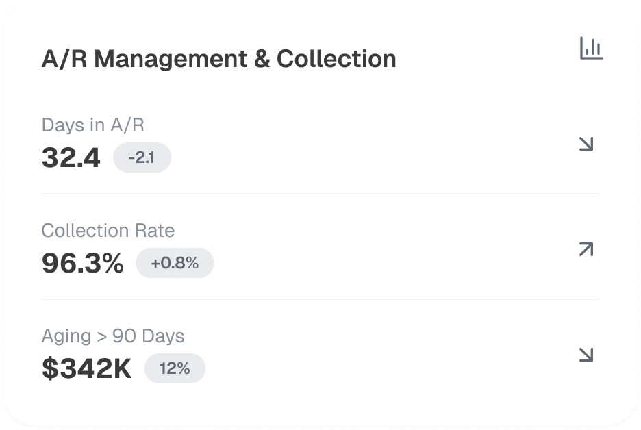 We perform aging analysis, payer follow-ups, and timely secondary & tertiary billing to maintain a low Days Sales Outstanding (DSO) and reduce A/R aging beyond 90 days. Our Key Performance Indicators (KPIs) tracking helps providers improve collections.