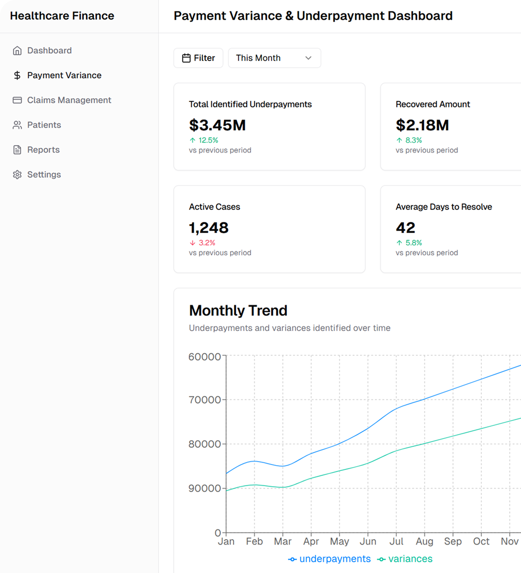 Payment Variance and Underpayment Services are designed to identify, analyze, and correct discrepancies between expected reimbursements and actual payments received